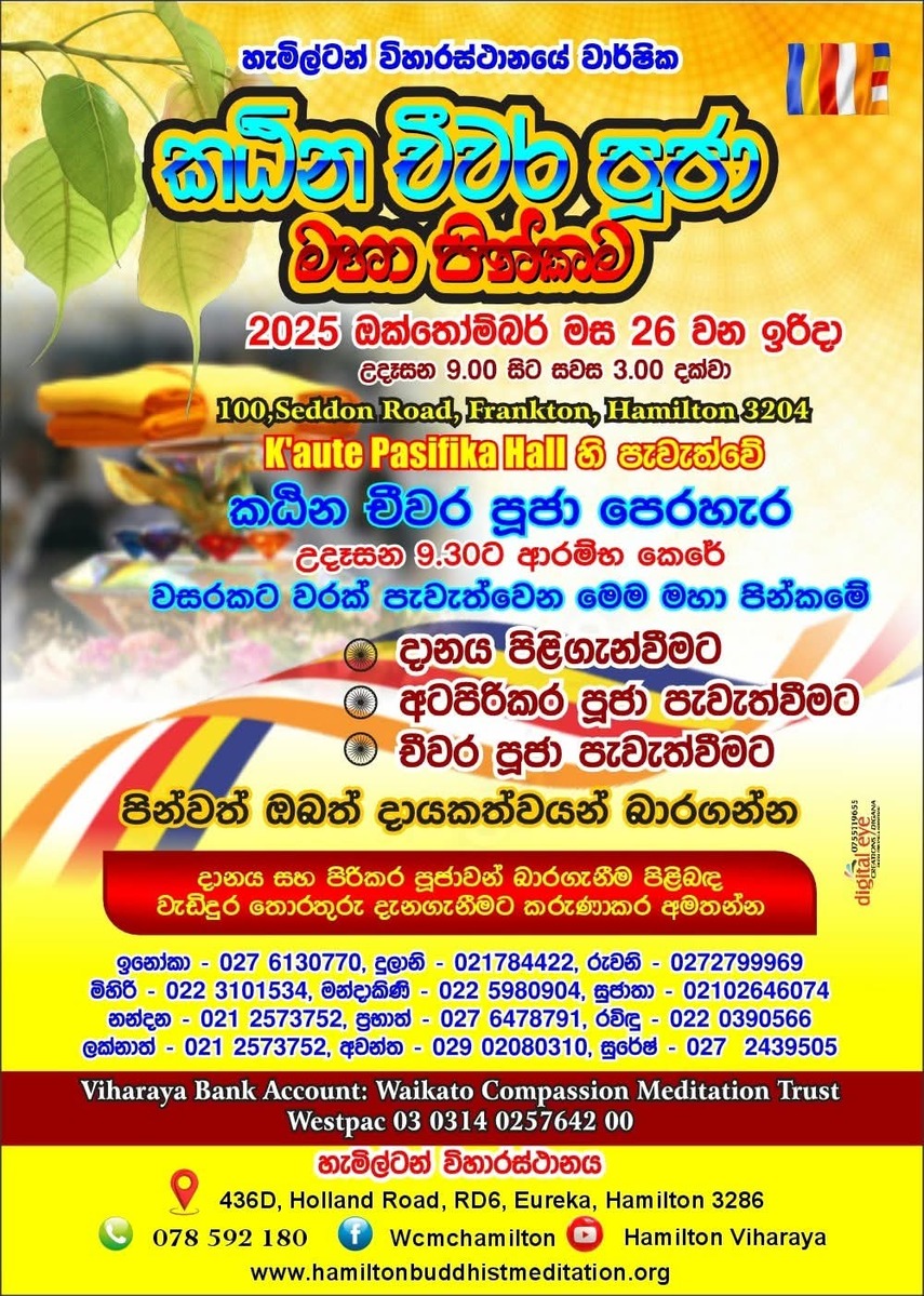Hamilton’s Waikato Compassion Meditation Centre (WCMC) is a Theravāda Buddhist vihāra established in the Sri Lankan tradition. While supported by the Sri Lankan community, it warmly welcomes everyone across the Waikato.
